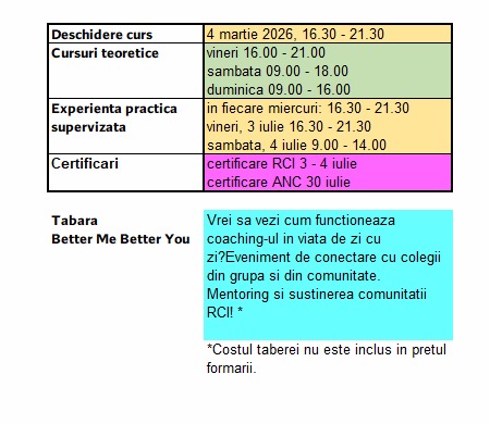 1. Pe toată perioada programului,  practica supervizată de coaching va mai avea loc săptămânal, miercurea, între orele 16.30-21.30 și în modulul special dedicat de tehnici bonus.